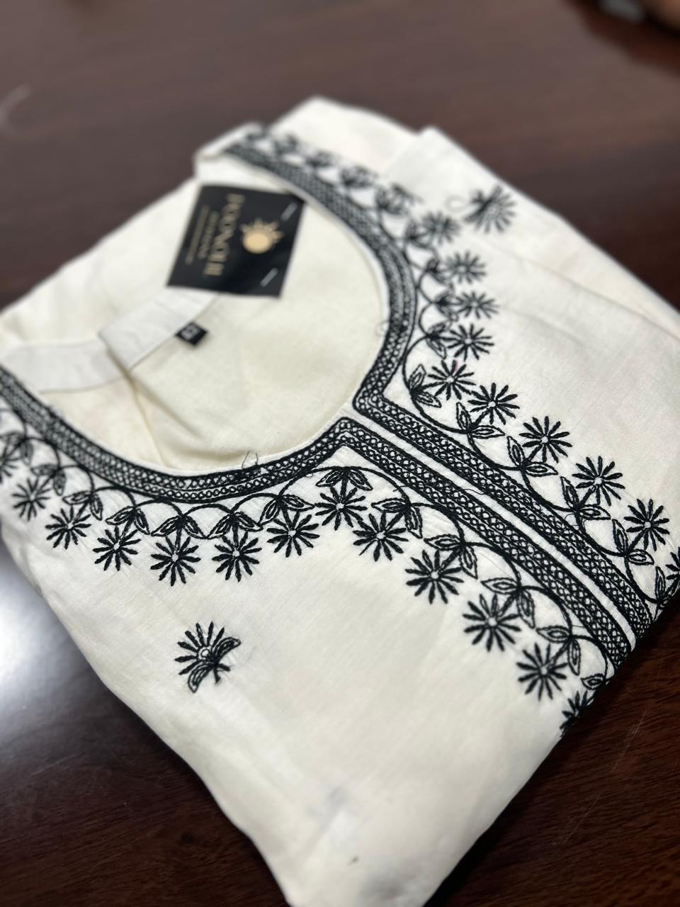 Cream color chikankari suit set with black color thread design on body same color dupatta with white thread work
