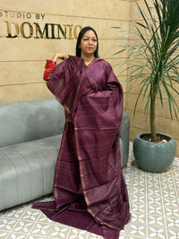 saree with rich jute weaving design on body and contrast border Red color with golden zairy design blouse plain