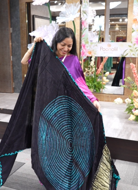 Black color saree with rich aqua blue color batik print design on pallu part and golden foil like design on pallu ,small design on borders