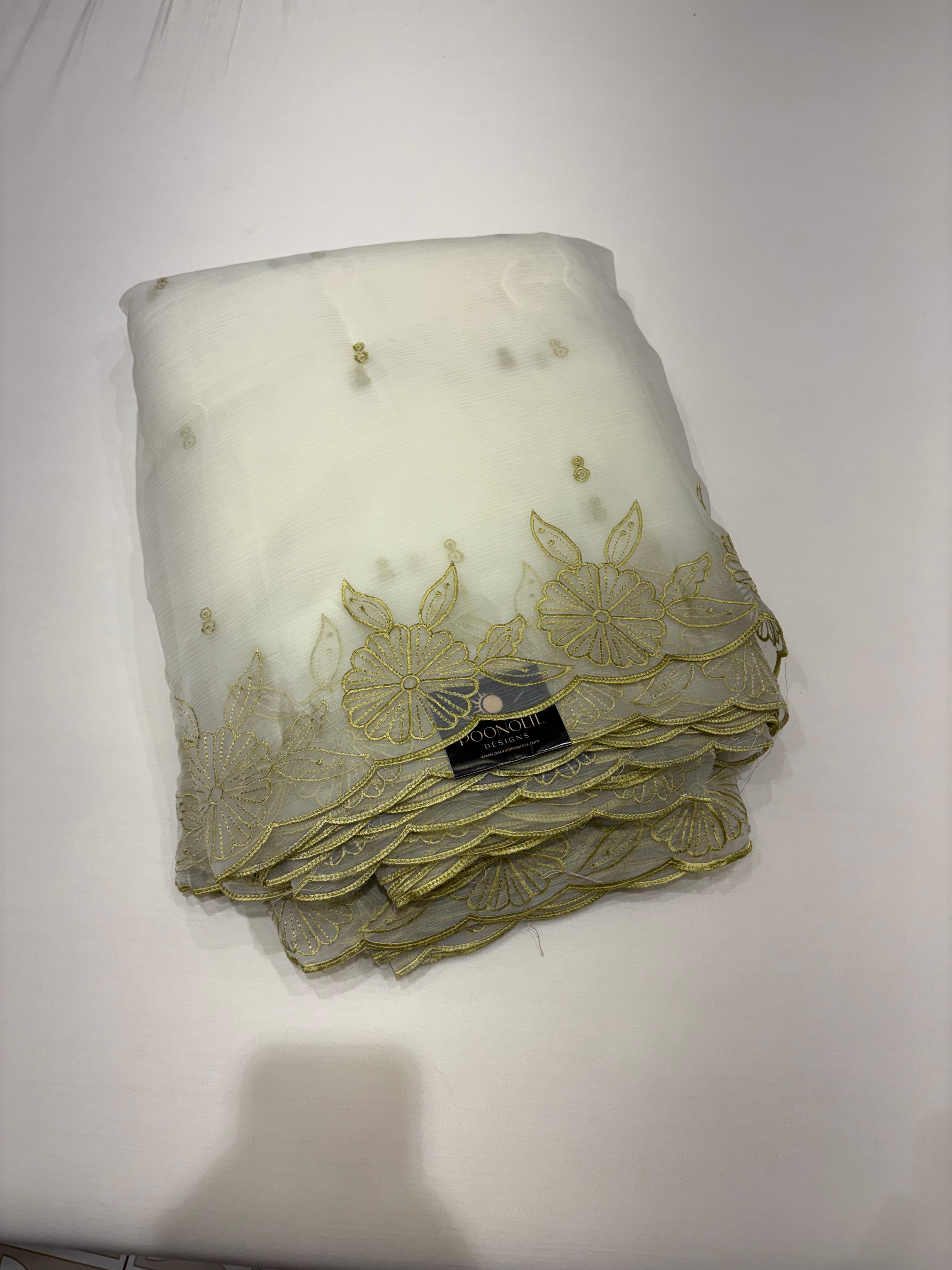 white color on base organza fabrics with Olive green color thread work on body and borders