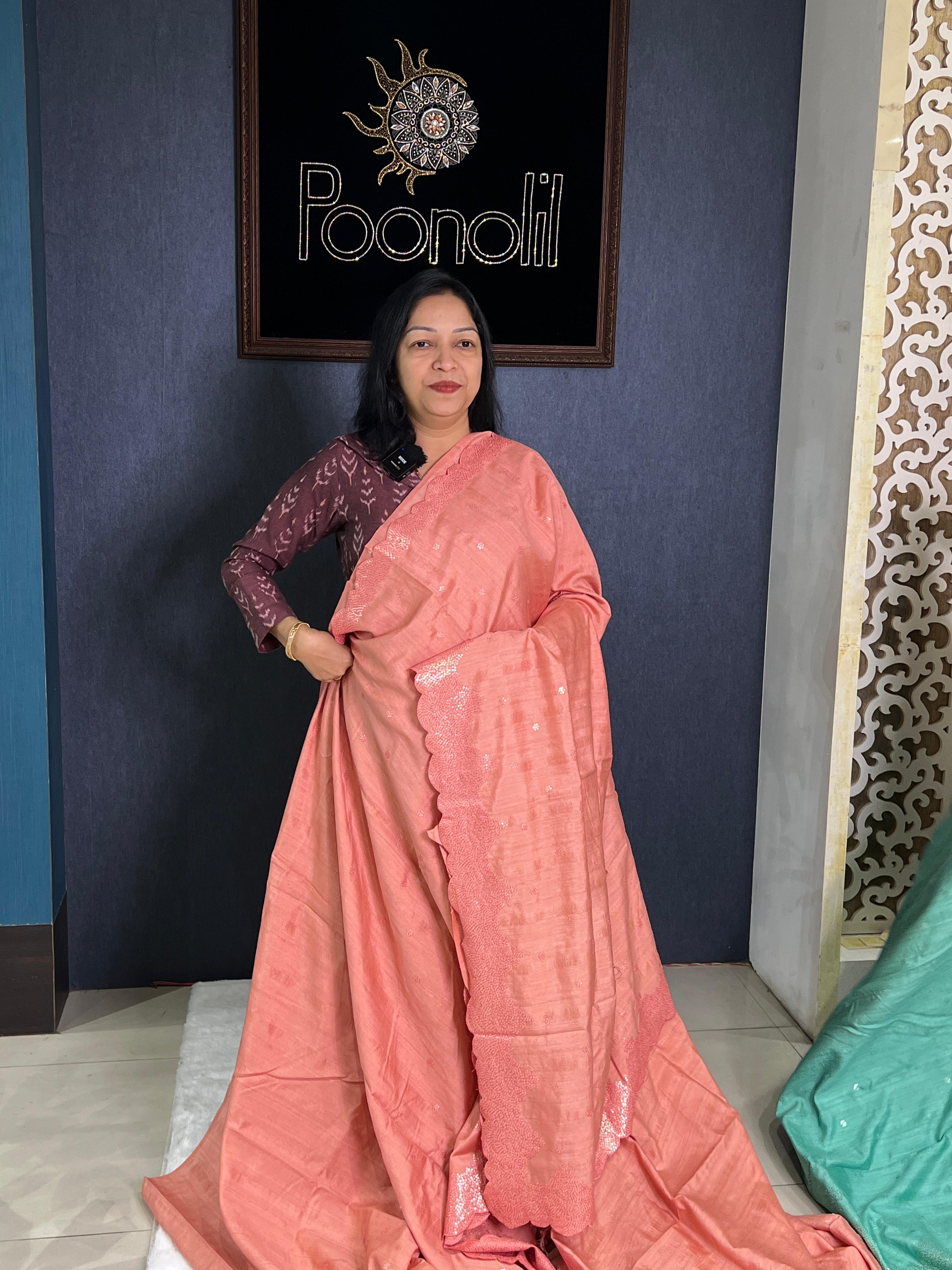 Peach shade saree with small sequence and thread work on borders and small butta on body