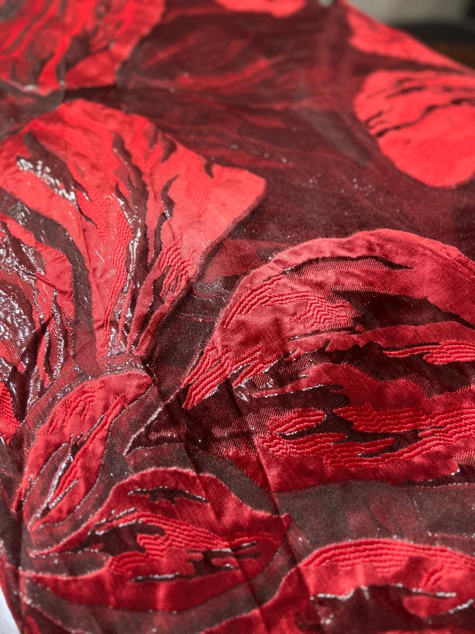 Bright red color material with cream color foil like design on body