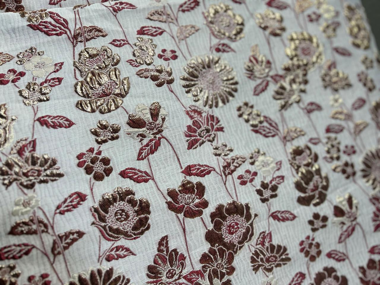 Off White color material with brick red color and golden color brocade design on body floral design