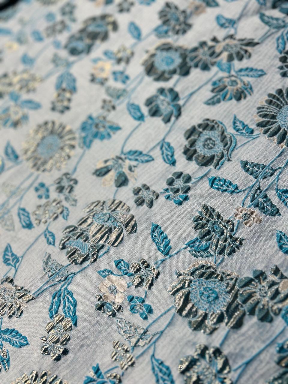 Off White color material with Light Blue color and golden color brocade design on body floral design