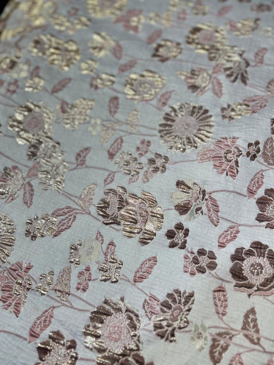 Off White color material with Dark pink color and golden color brocade design on body floral design