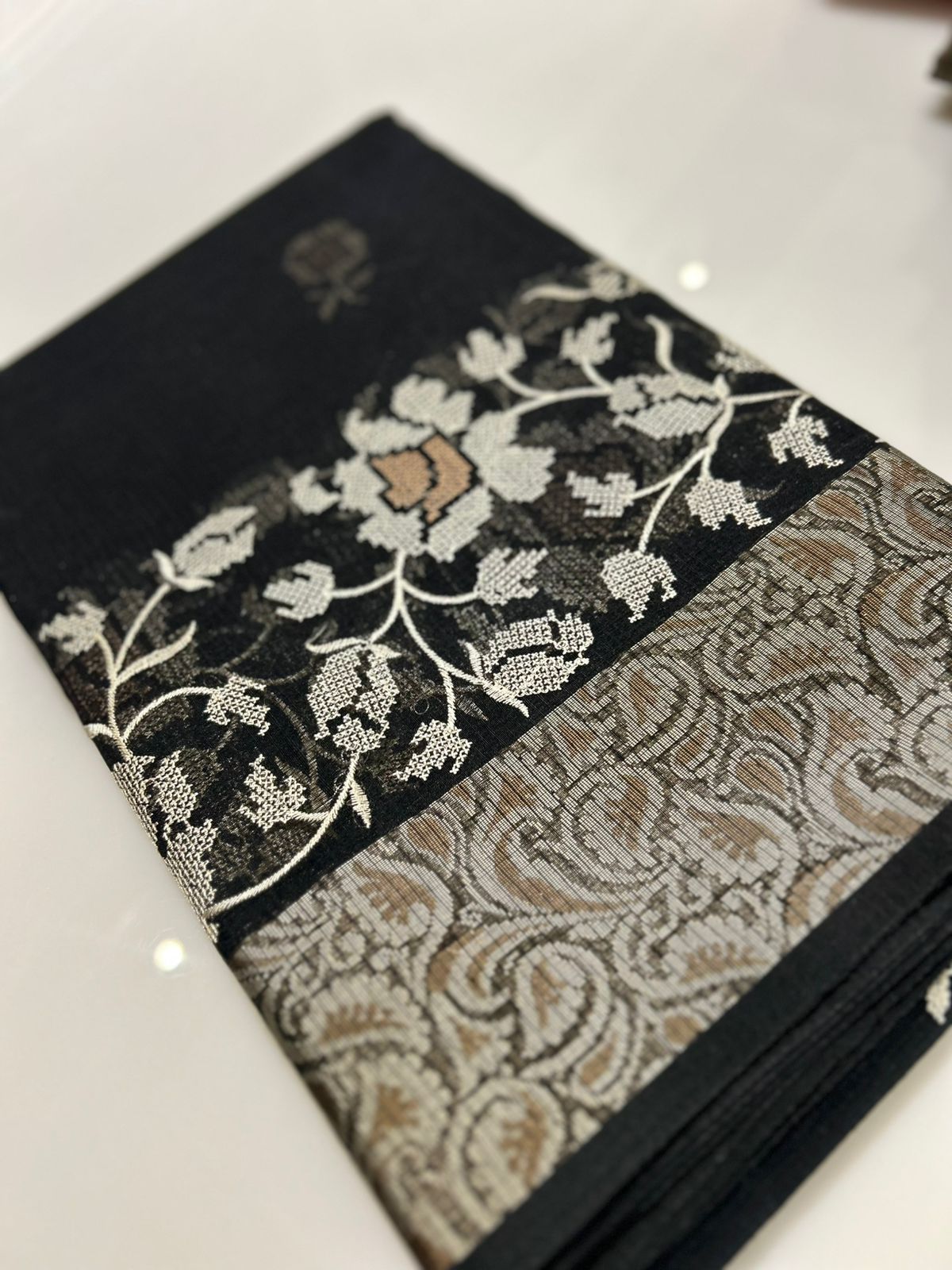 Black color saree with rich thread work design on borders and rich work on pallu and blouse