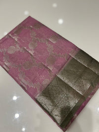 Dusty pink on body with rich golden zairy design contrast with Dusty green on borders and pallu