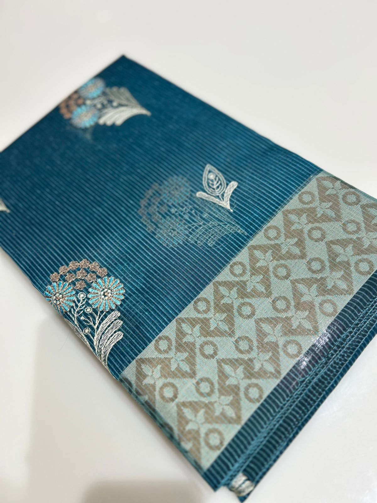 Blue color saree with rich thread work design on borders and rich work on pallu and blouse