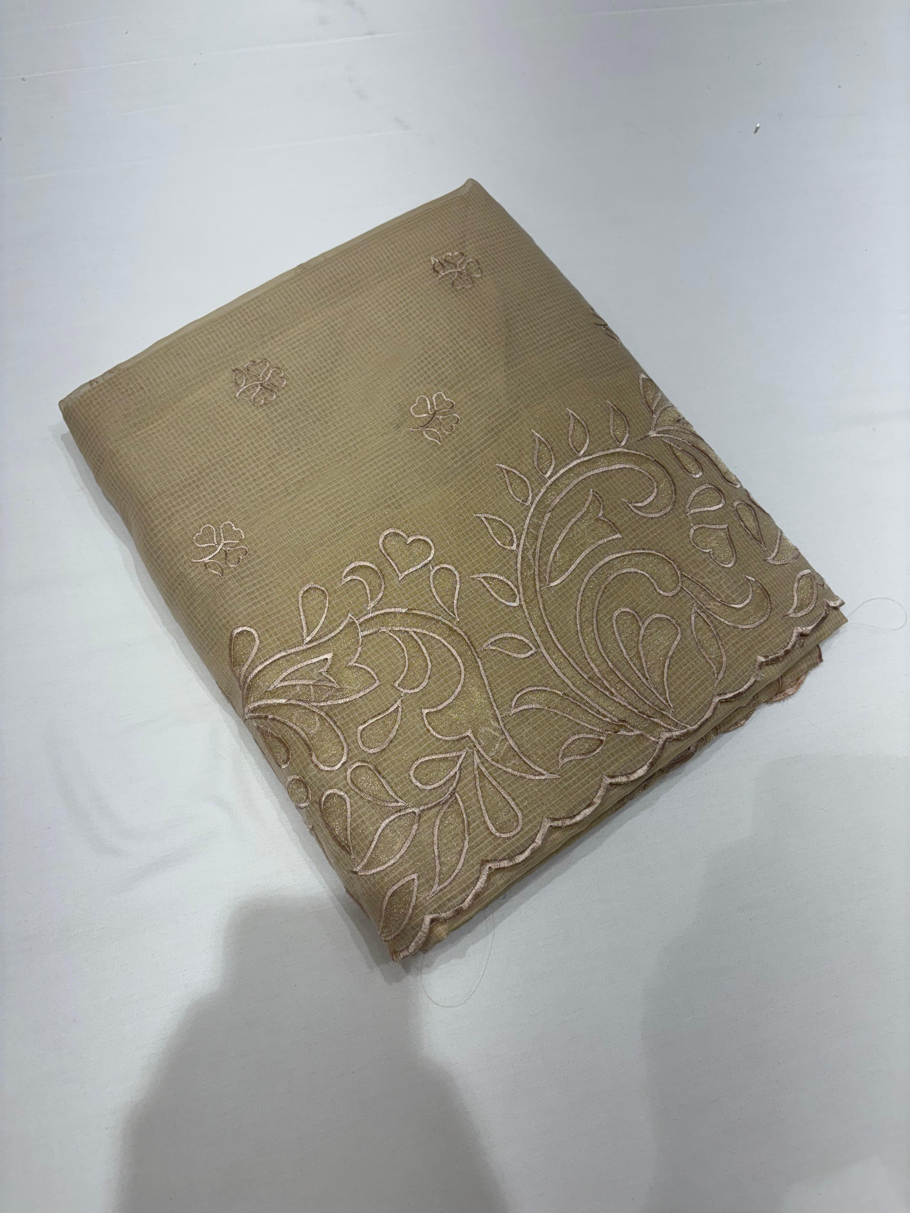 Dark chiku color net cotta saree with rich cross stitch design on one border and thread design on body