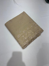 Dark chiku color net cotta saree with rich cross stitch design on one border and thread design on body