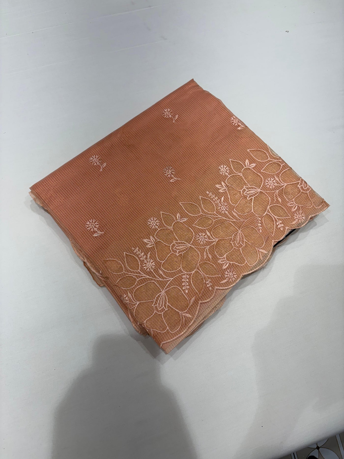 Peach color net cotta saree with rich cross stitch design on one border and thread design on body