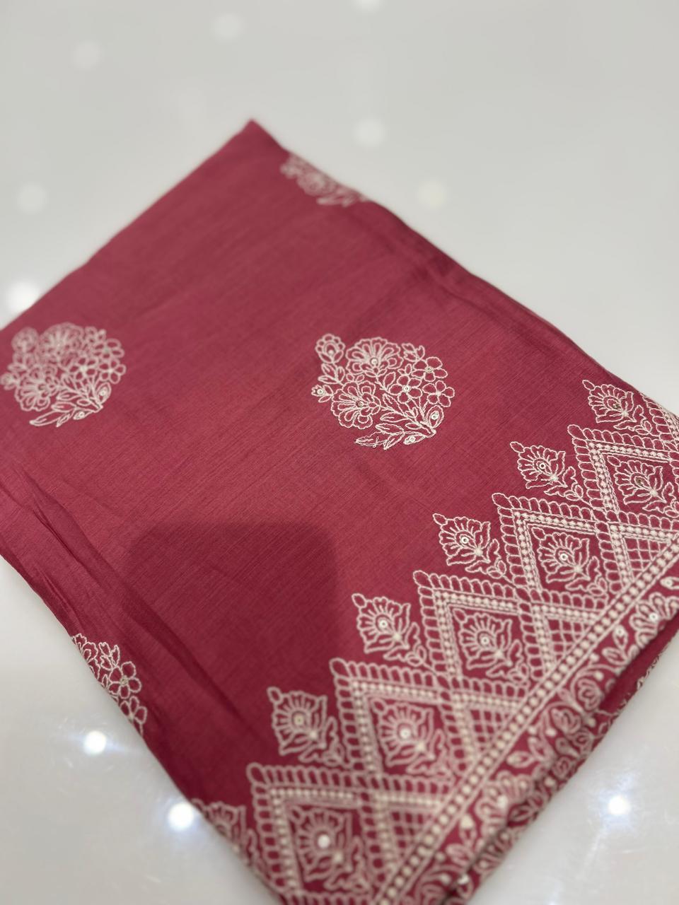 Peach pink color unstitched suit set with rich thread work on body and work on damn side same color dupatta with work same color bottom