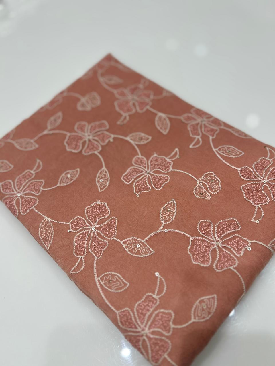 Peach color unstitched suit set with rich white color thread design on front portion dupatta same color work on front portion and bottom same color as dupatta