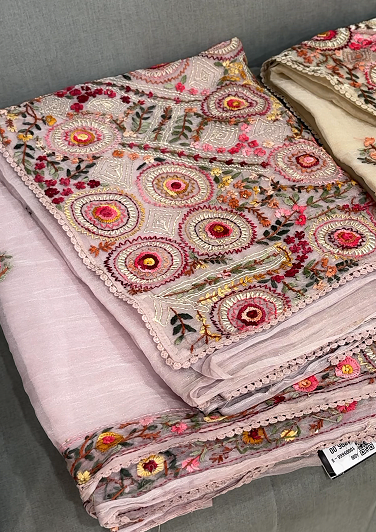 Blue shade organza thread work multi color saree with golden foil like design on body and digital printed design on body