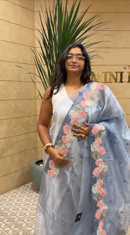 light blue shade organza cut work saree with golden foil like design on body and digital printed design on body