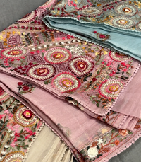 pink shade organza thread work multi color saree with golden foil like design on body and digital printed design on body
