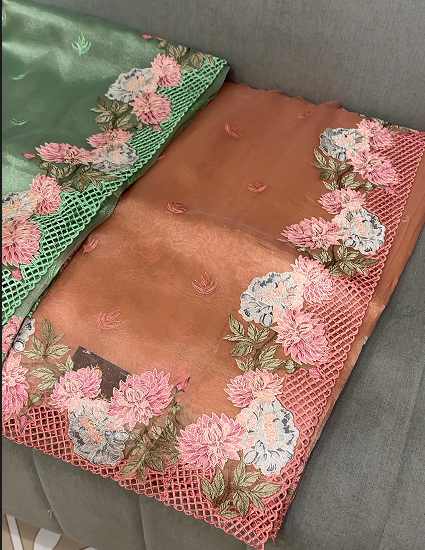 light blue shade organza cut work saree with golden foil like design on body and digital printed design on body