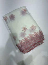 White color organza material with onion pink shade thread design on body and borders