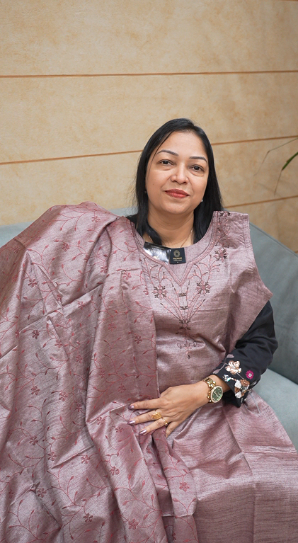 light lavander shade suit set in bamboo tussar material with rich work on front portion same color printed dupatta with work same color bottom