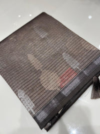 Brown shade saree with rich charcoal zairy design on body and stripe like design on body