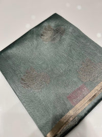Olive green shade saree with rich charcoal zairy design on body and stripe like design on body