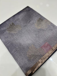 Dusty blueish gray shade saree with rich charcoal zairy design on body and stripe like design on body