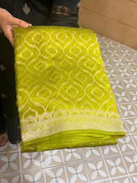 lemon green color saree with antic golden zairy check design on body with small butta ,and rich banarasi borders