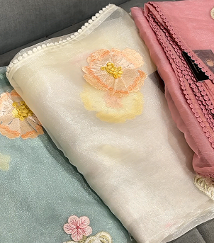 white shade organza cut work saree with golden foil like design on body and digital printed design on body