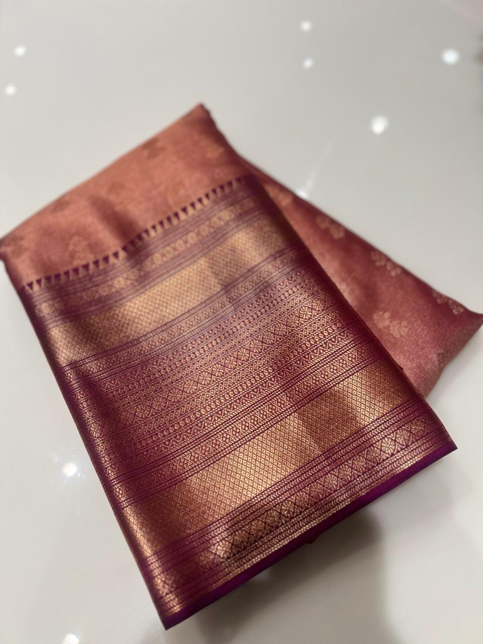 Onion pink to purple shade saree body full soft tissue with antic golden design on body and rich contrast border