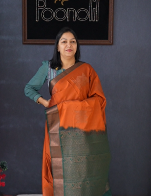 Orange to green color saree with rich anti golden design on border and rich design on body