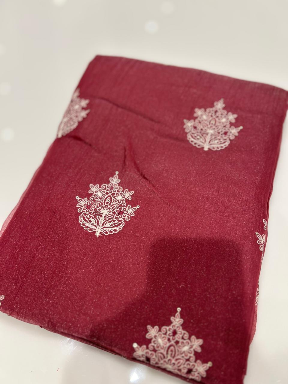 Peach pink color unstitched suit set with rich white color thread design on front portion dupatta same color with tread work ,bottom same color