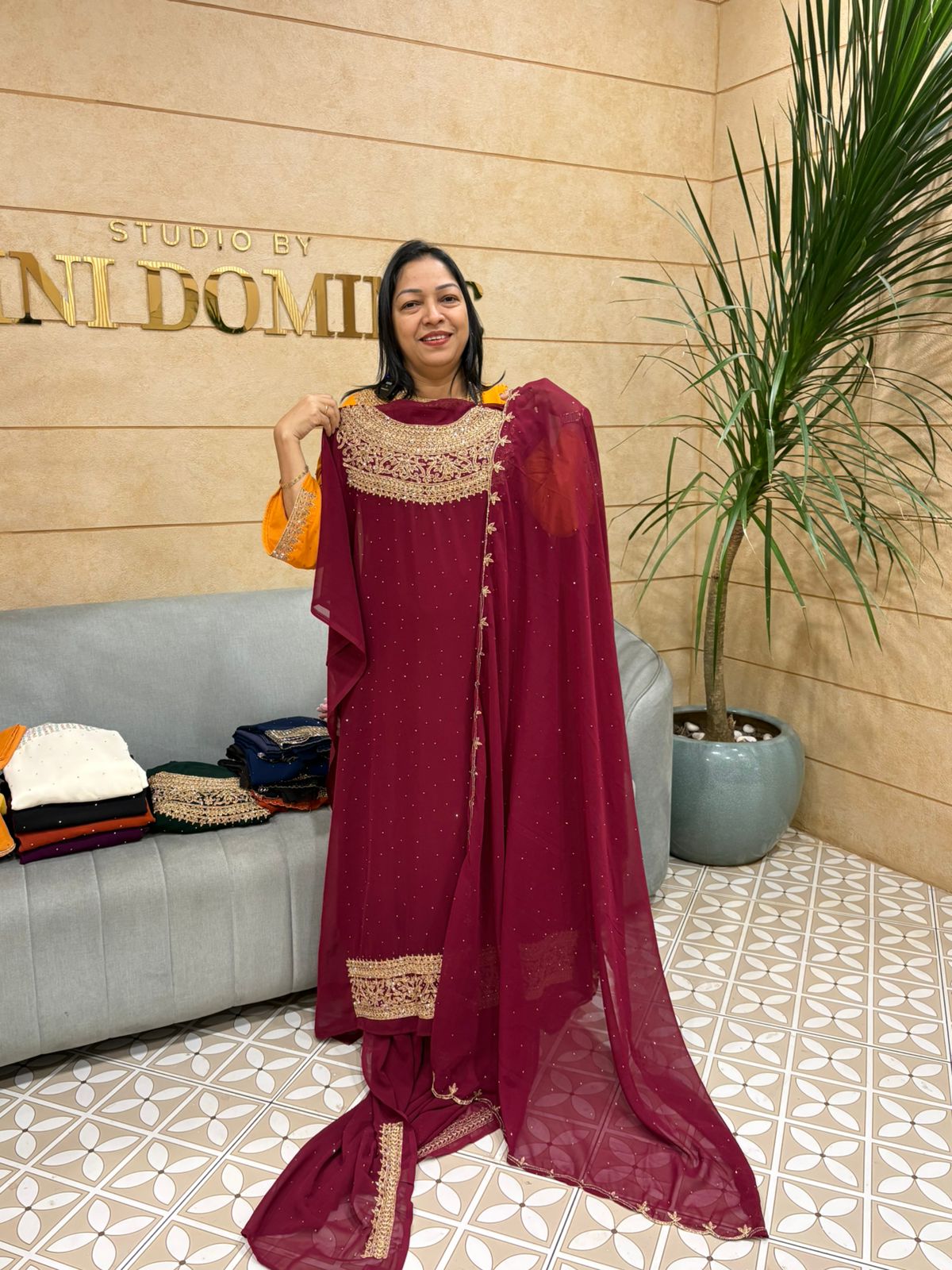 Brown color suit set with rich thread work on yoke portion and dupatta with thread work