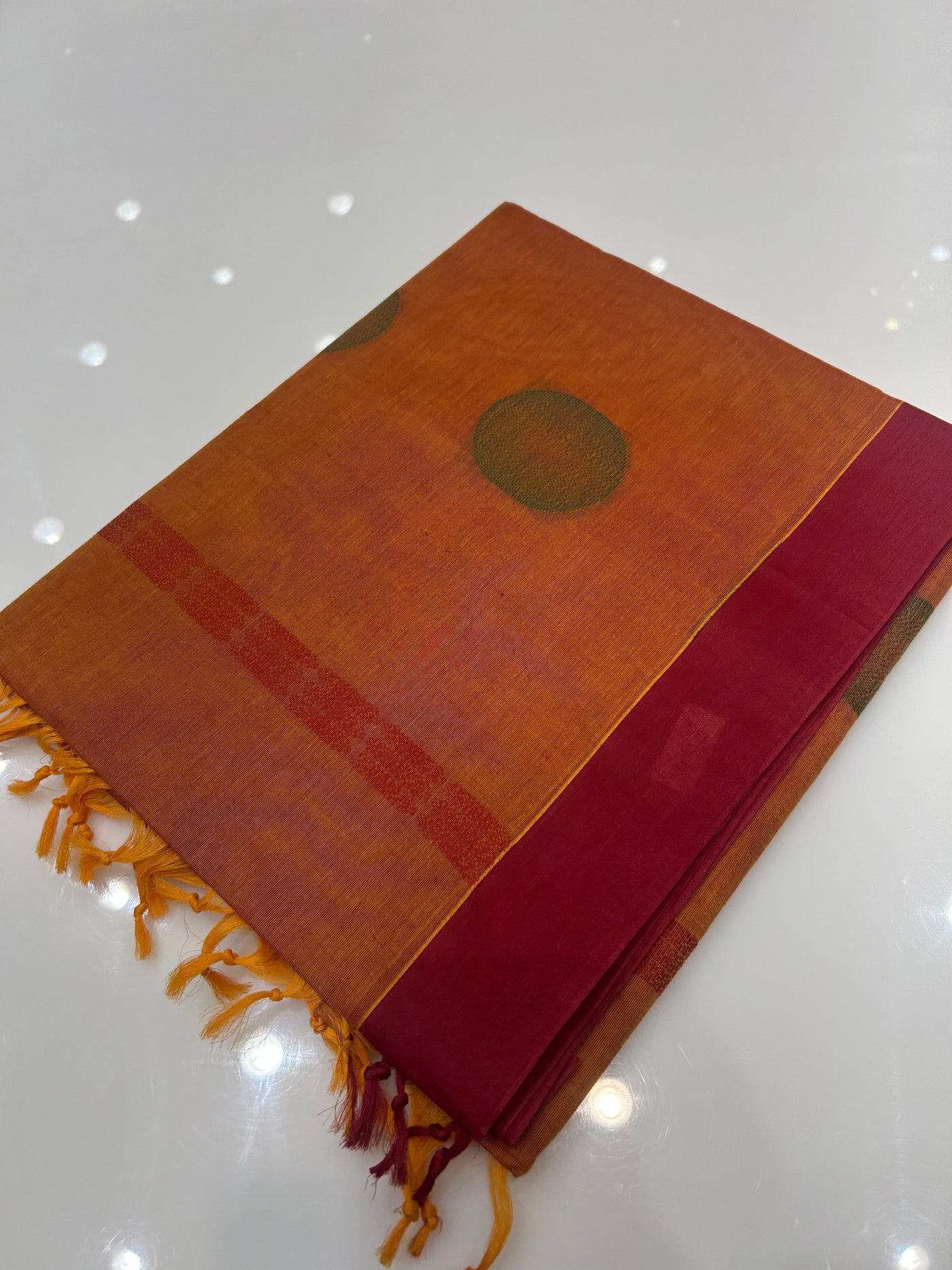 Orange color cotton saree with rich zairy color design pattern on body and rich thread design on pallu