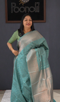 Dusty Green color saree with golden butta on body and rich zairy design on borders