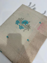 Golden color tissue saree with rich golden on body with Light peach pink color thread design on body