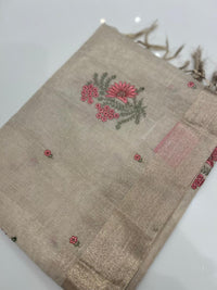 Golden color tissue saree with rich golden on body with Dark peach color thread design on body