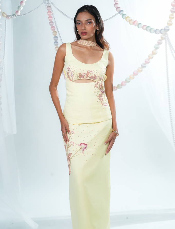 A dreamy butter-yellow two piece set that flatters every curve. Featuring delicate hand embroidery, graceful panel cuts, and a corset-inspired silhouette, this dress celebrates modern femininity. The highlight? A pearl-draped dupatta that adds timeless charm to every step.