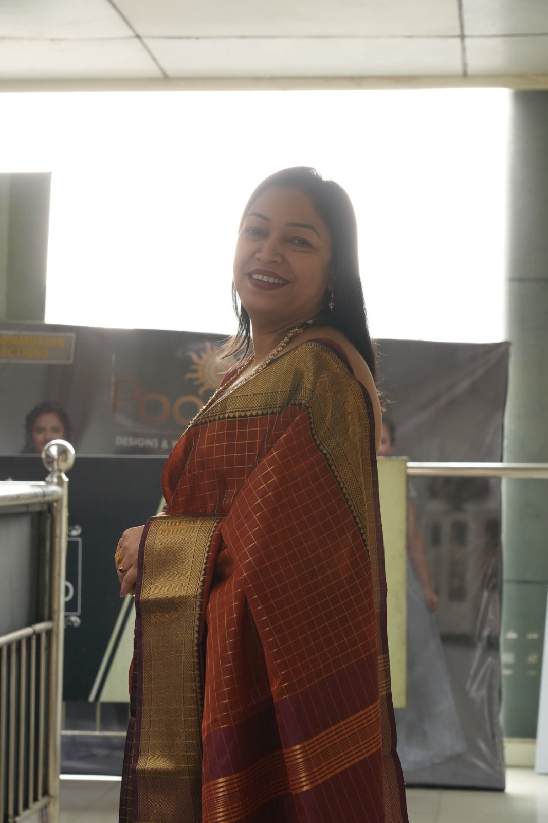 Maroon color saree with rich golden check pattern on body and rich golden zairy design on pallu