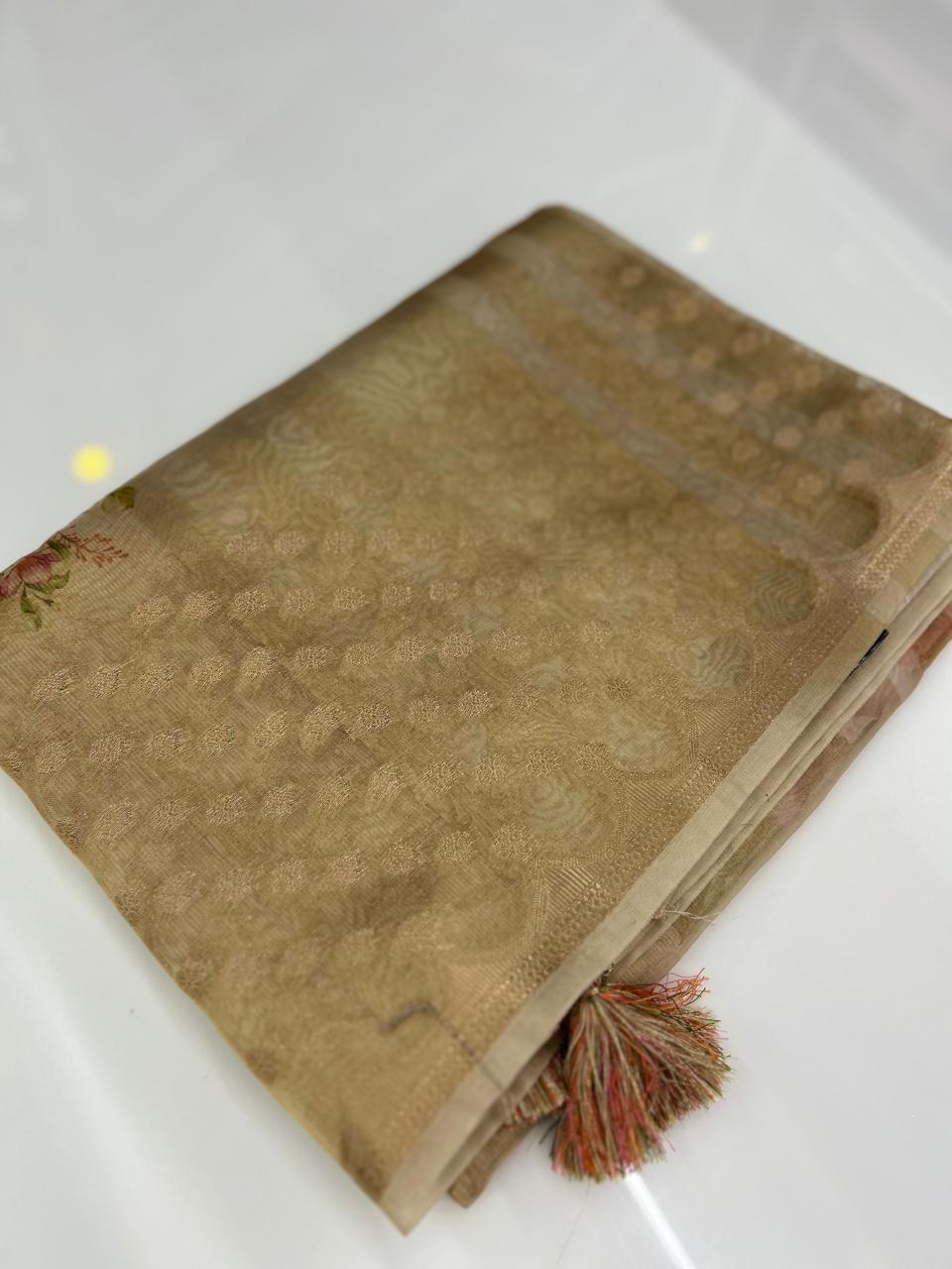 Golden Tissue Organza saree with peach color small floral digital print on body with golden design on both borders ,rich floral design on pallu