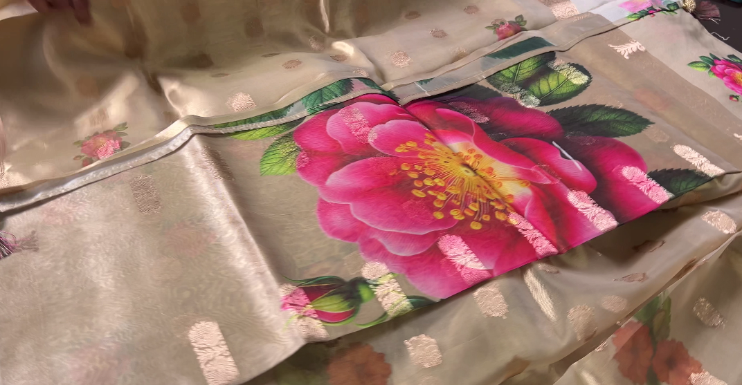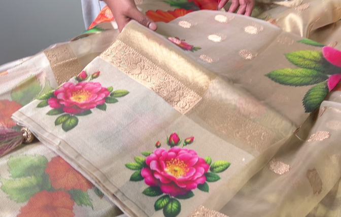 Golden Tissue Organza saree with peach color small floral digital print on body with golden design on both borders ,rich floral design on pallu