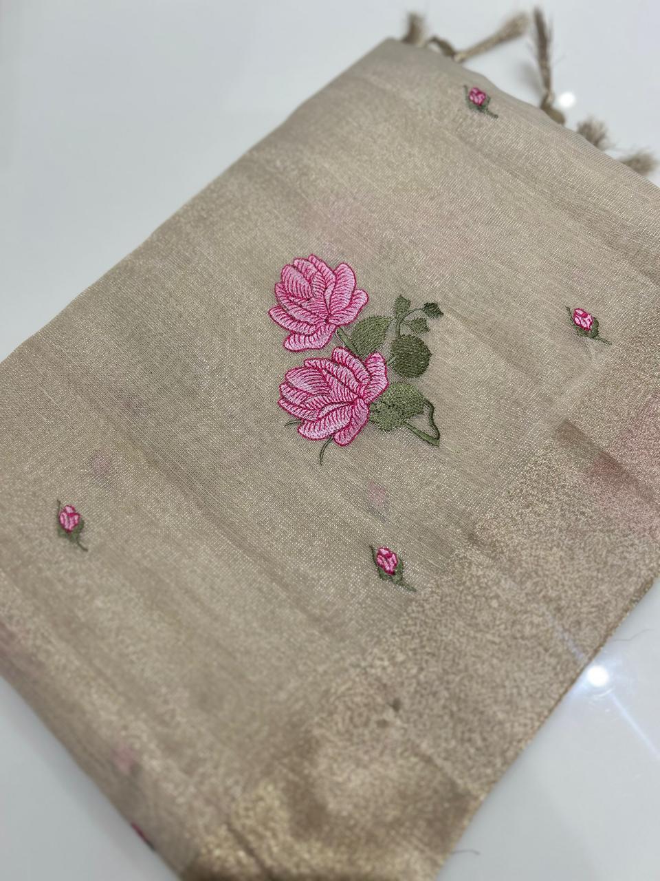 Golden color tissue saree with rich golden on body with Pink color thread design on body