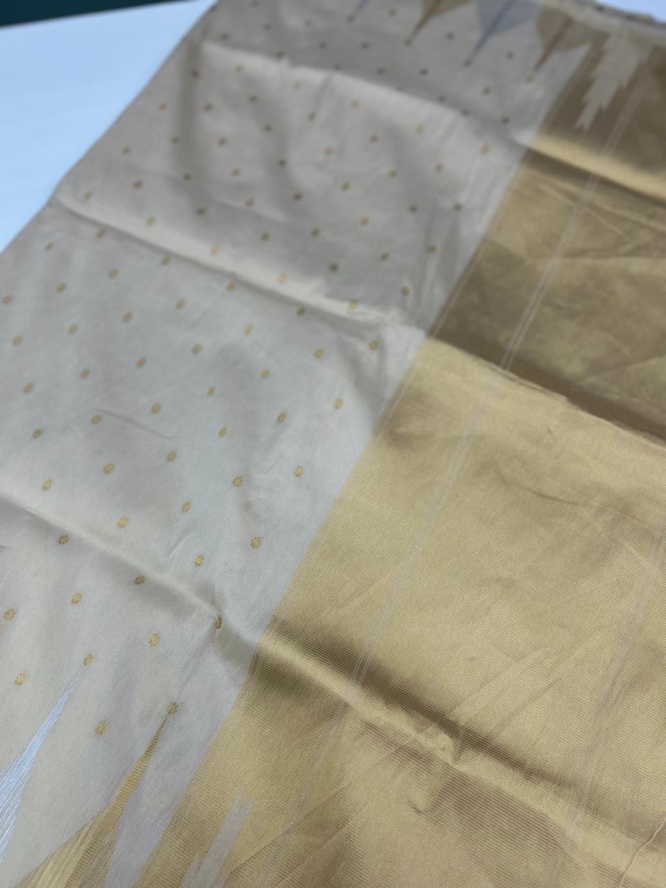 Golden Tissue saree with golden and silver temple like borders on both borders and rich design pallu blouse plain